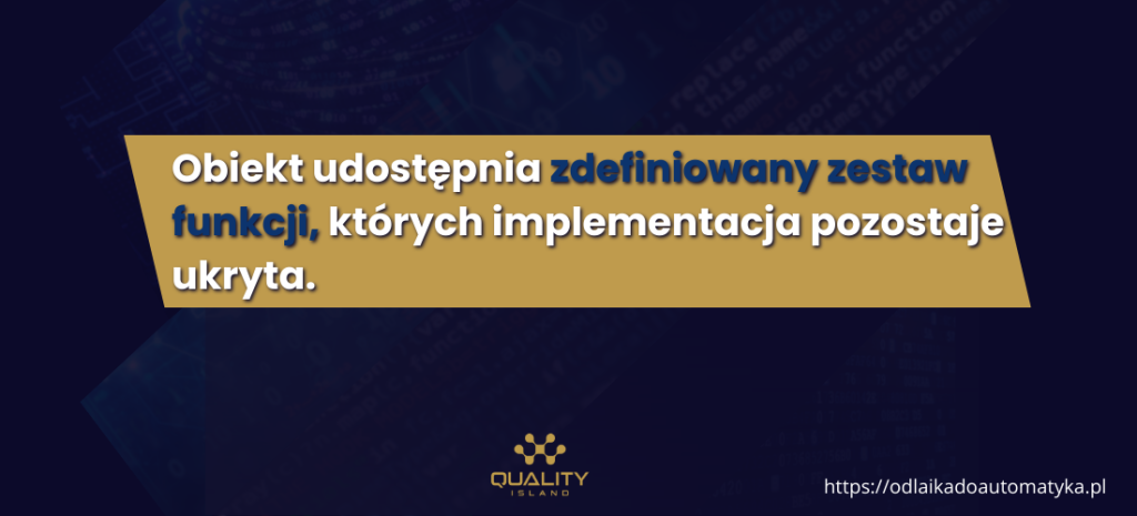 Obiekt udostępnia zdefiniowany zestaw funkcji, których implementacja pozostaje ukryta.