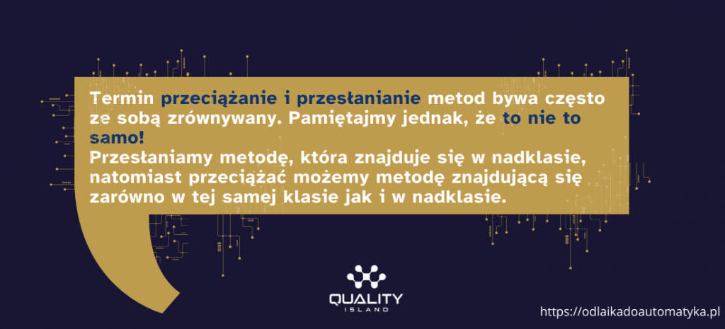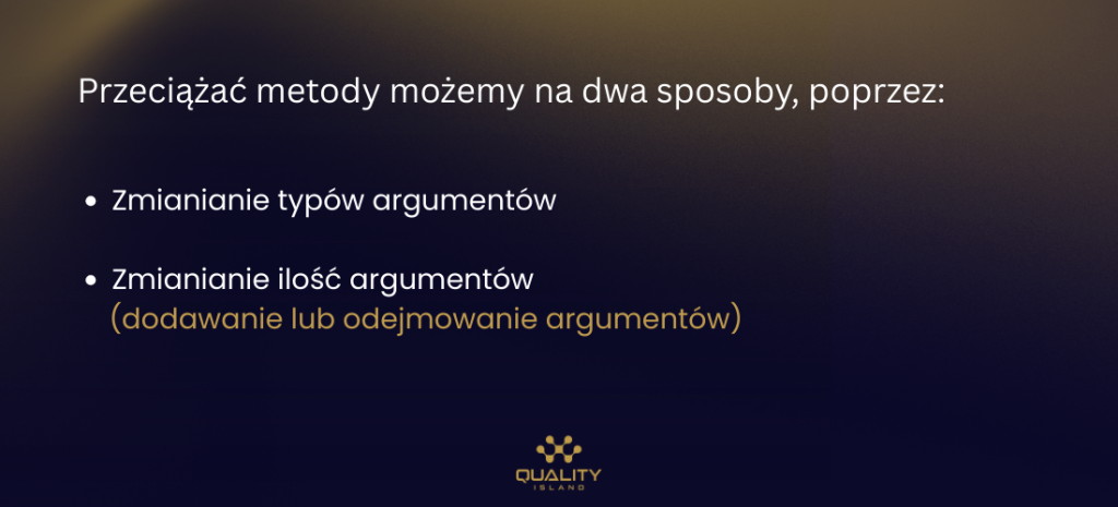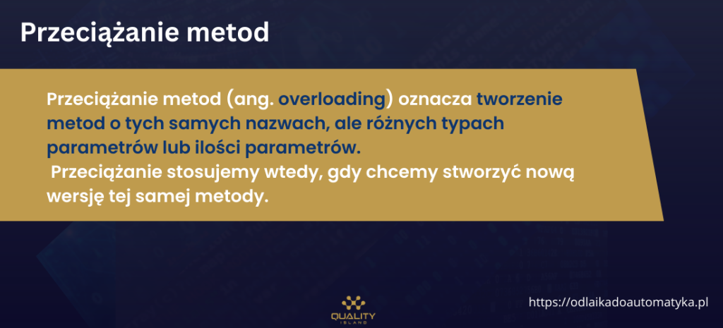 Przeciążanie metod (ang. overloading) oznacza tworzenie metod o tych samych nazwach, ale różnych typach parametrów lub ilości parametrów. Przeciążanie metod stosujemy wtedy, gdy chcemy stworzyć nową wersję tej samej metody.