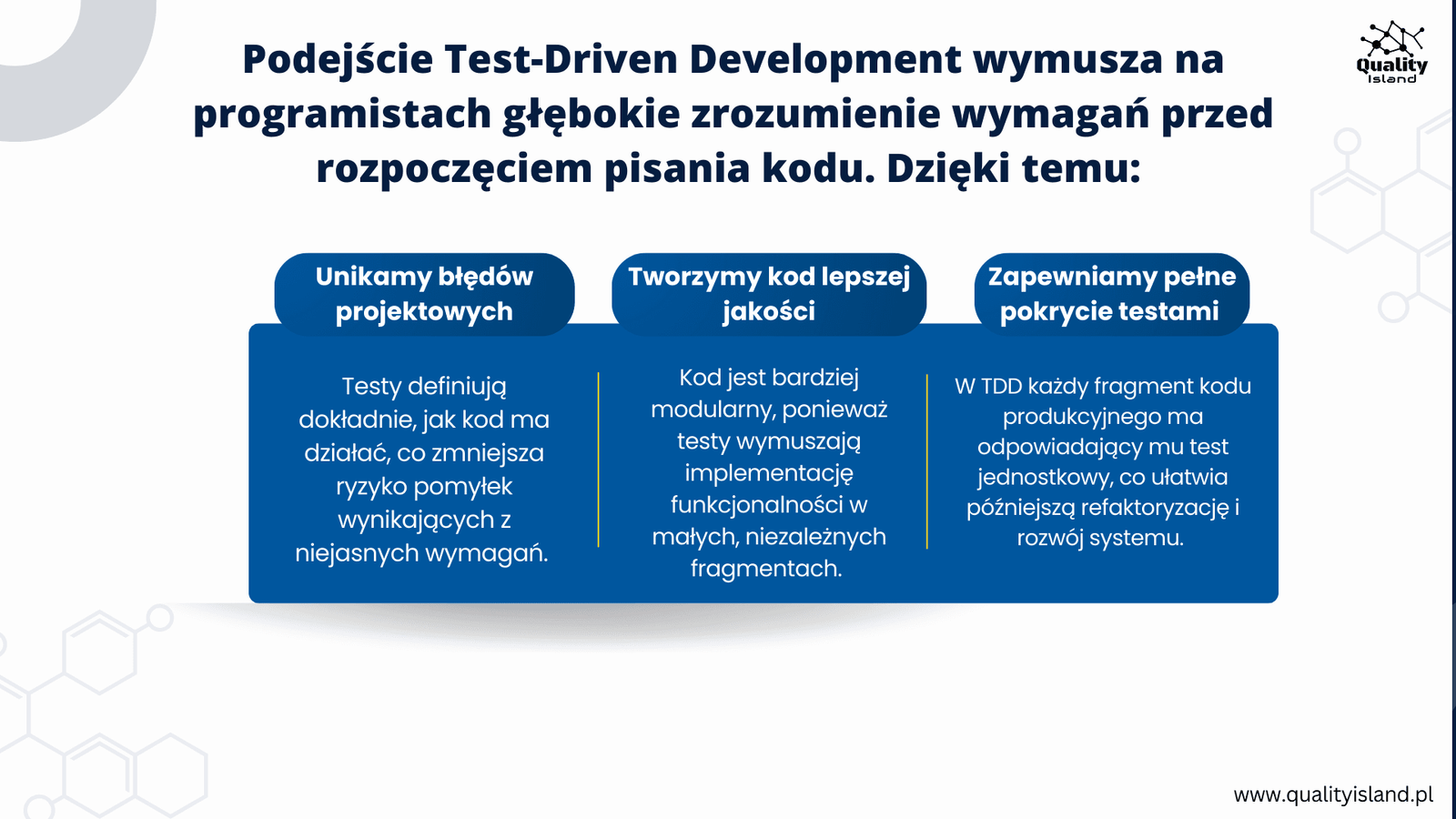 • Jest bardziej zgodny z wymaganiami biznesowymi, ponieważ testy jasno definiują, co dokładnie powinno zostać zaimplementowane.