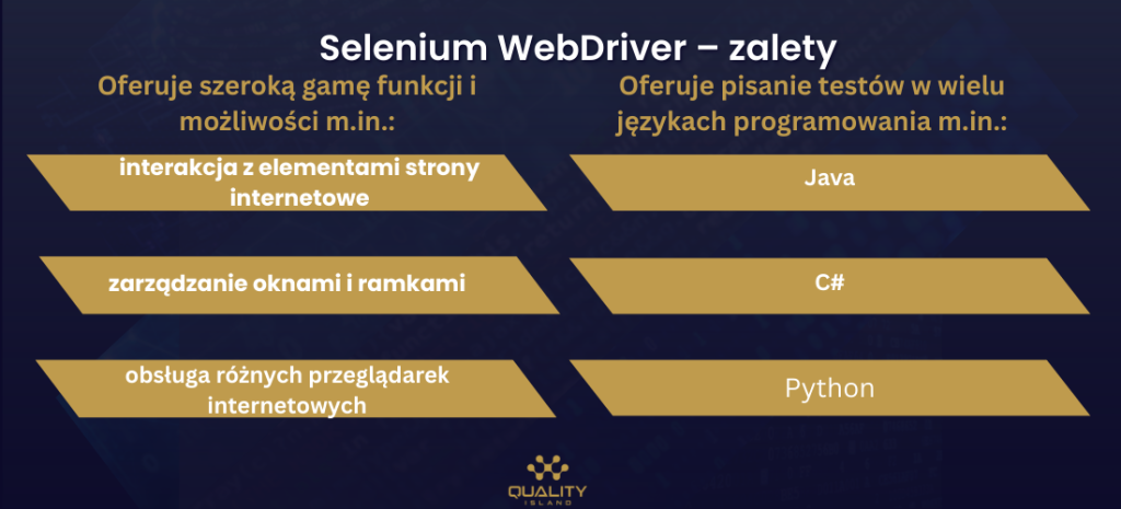 Zaletą Selenium WebDriver jest jego wsparcie dla wielu języków programowania, co umożliwia programistom korzystanie z ich preferowanego języka. Ponadto, Selenium WebDriver jest łatwy do nauczenia i istnieje wiele dostępnych zasobów edukacyjnych, takich jak kursy i szkolenia, które pomagają w opanowaniu tego narzędzia. Zachęcamy do skorzystania z naszego świetnego 4 dniowego szkolenia z Automatyzacji testów z wykorzystaniem Selenium Webdriver https://qualityisland.pl/automatyzacja-testow-selenium-kurs-kompleksowy/ . Szkolenie to jest dedykowane dla wszystkich początkujących osób, które chcą poznać świat automatyzacji testów.