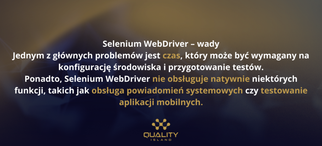 Jednak Selenium WebDriver ma również swoje wady. Jednym z głównych problemów jest czas, który może być wymagany na konfigurację środowiska i przygotowanie testów. Ponadto, Selenium WebDriver nie obsługuje natywnie niektórych funkcji, takich jak obsługa powiadomień systemowych czy testowanie aplikacji mobilnych. Ale z wszystkimi ograniczeniami również możemy sobie poradzić!