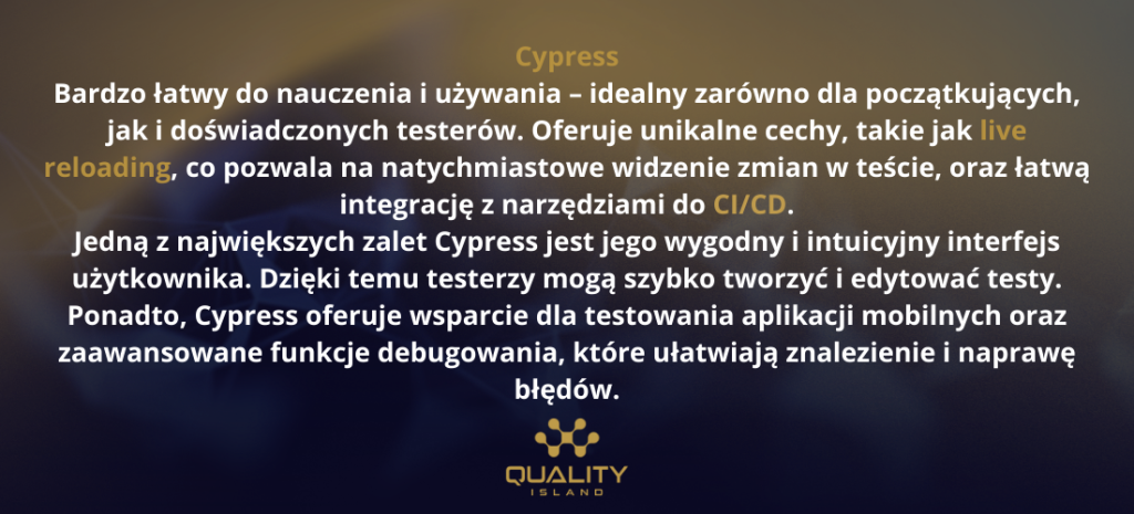Cypress jest nowoczesnym narzędziem, które oferuje łatwy interfejs użytkownika i wiele przydatnych funkcji. Jest idealny dla projektów, które wymagają szybkiego i intuicyjnego tworzenia testów, a także testowania aplikacji mobilnych.