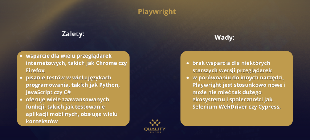 Playwright jest wszechstronnym narzędziem, które oferuje wsparcie dla wielu przeglądarek i zaawansowanych funkcji. Jest idealny dla projektów, które wymagają testowania na różnych przeglądarkach, a także testowania aplikacji mobilnych. Jednak niektóre starsze wersje przeglądarek mogą nie być obsługiwane, a Playwright jest stosunkowo nowe na rynku.