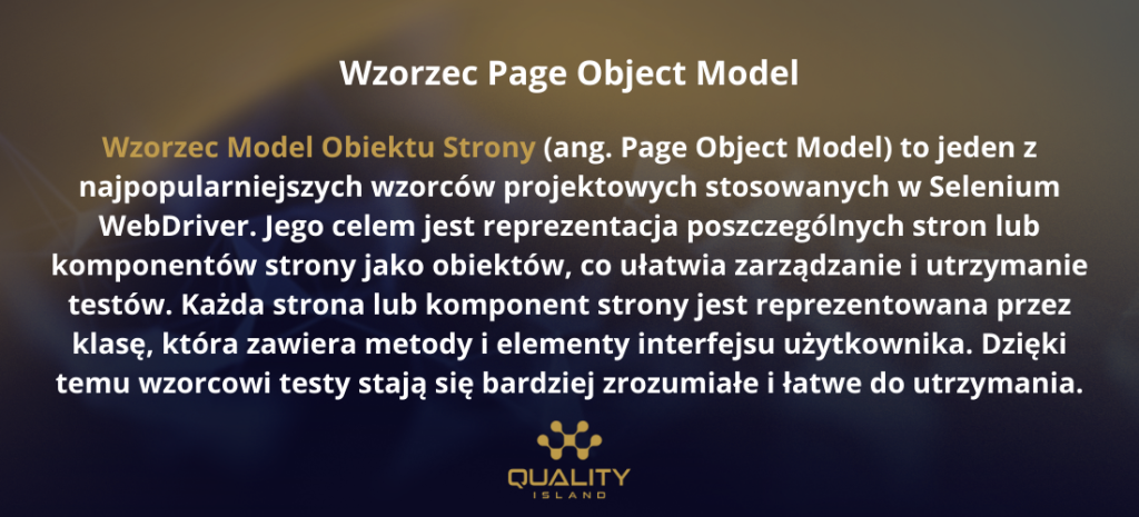 Wzorzec Model Obiektu Strony (ang. Page Object Model) to jeden z najpopularniejszych wzorców projektowych stosowanych w Selenium WebDriver. Jego celem jest reprezentacja poszczególnych stron lub komponentów strony jako obiektów, co ułatwia zarządzanie i utrzymanie testów. Każda strona lub komponent strony jest reprezentowana przez klasę, która zawiera metody i elementy interfejsu użytkownika. Dzięki temu wzorcowi testy stają się bardziej zrozumiałe i łatwe do utrzymania.