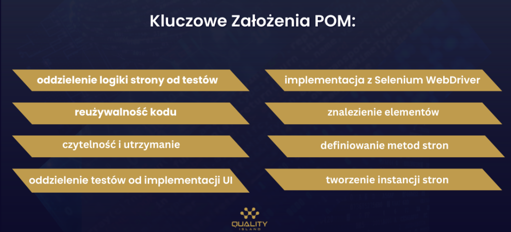 Oddzielenie Logiki Strony od Testów: POM polega na tworzeniu osobnych klas dla każdej strony (lub znaczącego komponentu strony) aplikacji webowej, której testowanie jest przewidziane. Każda taka klasa zawiera elementy (np. przyciski, pola tekstowe) i metody (akcje, które można wykonać na stronie) specyficzne dla tej strony.