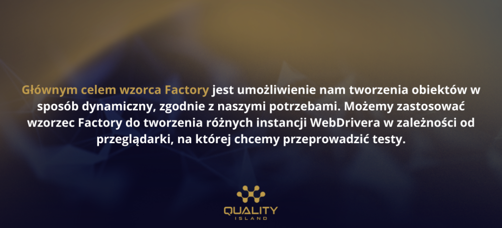 Głównym celem wzorca Factory jest umożliwienie nam tworzenia obiektów w sposób dynamiczny, zgodnie z naszymi potrzebami. Możemy zastosować wzorzec Factory do tworzenia różnych instancji WebDrivera w zależności od przeglądarki, na której chcemy przeprowadzić testy.