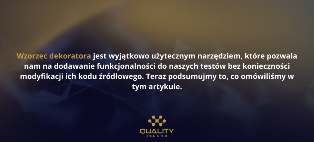 Wzorzec dekoratora jest wyjątkowo użytecznym narzędziem, które pozwala nam na dodawanie funkcjonalności do naszych testów bez konieczności modyfikacji ich kodu źródłowego. Teraz podsumujmy to, co omówiliśmy w tym artykule.