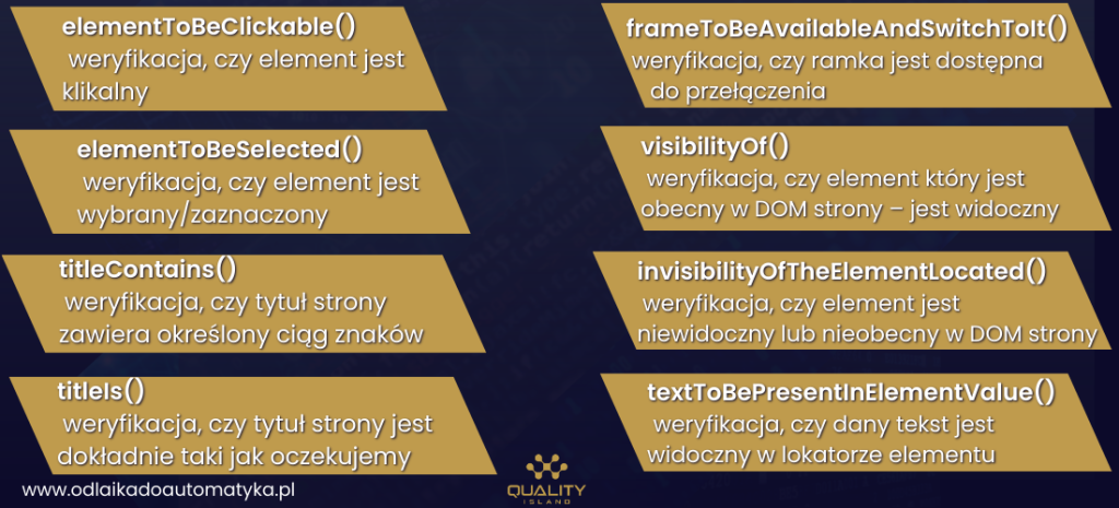 Klasa ExpectedConditions oferuje zbiór predefiniowanych warunków oczekiwania na wznowienie działania kodu. Poniżej prezentuję warunki, które są najczęściej używane w codziennej pracy: