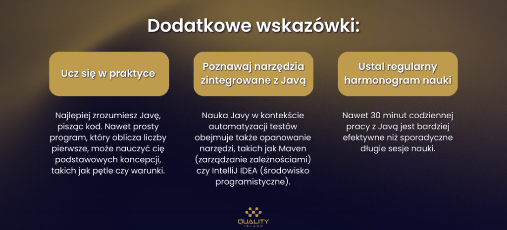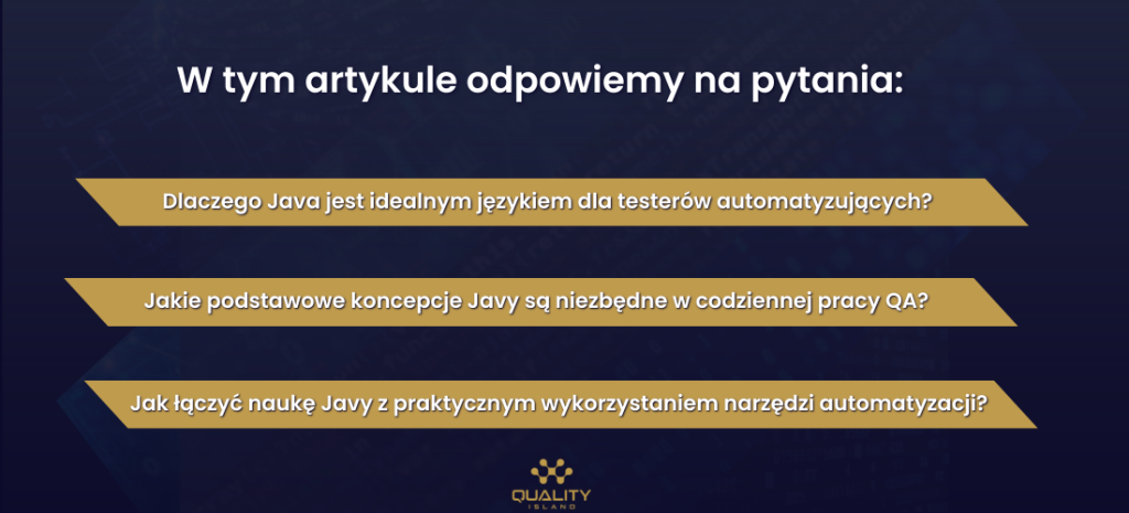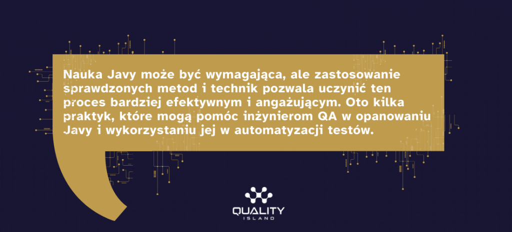 Jeśli chcesz przyspieszyć wejście w automatyzację w Javie i uniknąć błądzenia po przypadkowych tutorialach, Quality Island może pomóc Ci ułożyć praktyczną ścieżkę rozwoju: od fundamentów Javy pod testy, przez framework (Selenium/TestNG/JUnit), po dobre praktyki w strukturze testów i integrację z CI/CD.