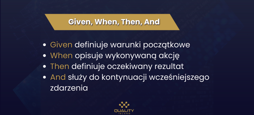 Gherkin posiada charakterystyczną budowę i nieskomplikowaną składnię. Każdy scenariusz składa się z następujących elementów – słów kluczowych: