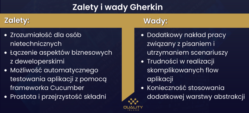 Podobnie jak każde narzędzie, Gherkin ma swoje zalety i wady. Wśród zalet można wymienić: