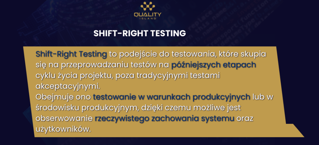 Shift-Right Testing to podejście testowania, które skupia się na przeprowadzaniu testów na późniejszych etapach cyklu życia projektu, poza tradycyjnymi testami akceptacyjnymi. Obejmuje ono testowanie w warunkach produkcyjnych lub w środowisku produkcyjnym. Rozwiązanie ma na celu zdobycie informacji zwrotnych z użytkowania systemu w rzeczywistych warunkach oraz monitorowanie i testowanie systemu po wdrożeniu. Skupia się na identyfikacji problemów, optymalizacji systemu i dostosowywaniu go do rzeczywistych potrzeb użytkowników.
