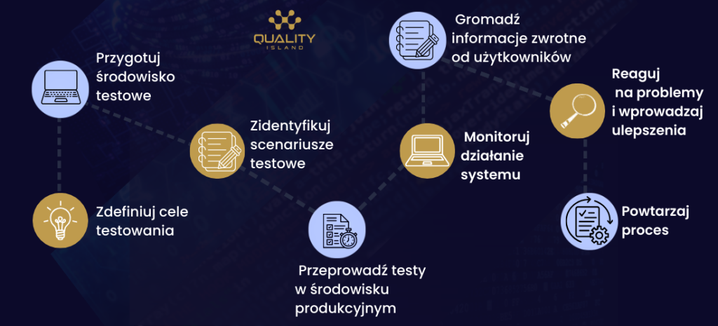 • Wykrywanie rzeczywistych problemów: Nie wszystkie błędy można wykryć w środowisku testowym. Testowanie w środowisku produkcyjnym pozwala na zidentyfikowanie problemów, które mogłyby zostać pominięte.