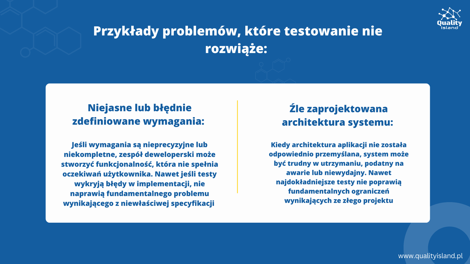 Skupienie się wyłącznie na testowaniu przypomina leczenie objawów choroby zamiast jej przyczyn. O ile testowanie jest niezbędne do weryfikacji poprawności działania aplikacji, to samo w sobie nie wystarczy, aby zapewnić wysoki poziom jakości. Problemy leżące u podstaw, takie jak niejasne wymagania, źle zaprojektowana architektura czy brak dobrych praktyk programistycznych, pozostaną nierozwiązane, nawet jeśli zainwestujemy znaczną ilość czasu i zasobów w intensywne testy.