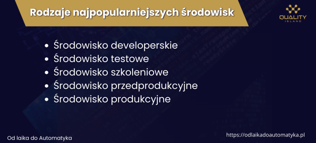 Środowisko testowe jest jednym z kilku typów środowisk. Poza wspomnianym środowiskiem testowym są jeszcze inne, takie jak: