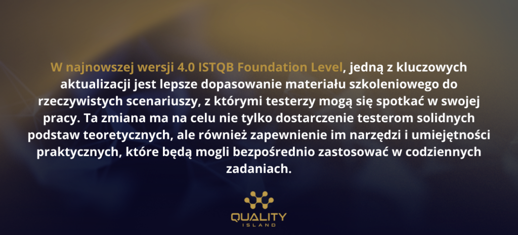 W najnowszej wersji 4.0 ISTQB Foundation Level, jedną z kluczowych aktualizacji jest lepsze dopasowanie materiału szkoleniowego do rzeczywistych scenariuszy, z którymi testerzy mogą się spotkać w swojej pracy. Ta zmiana ma na celu nie tylko dostarczenie testerom solidnych podstaw teoretycznych, ale również zapewnienie im narzędzi i umiejętności praktycznych, które będą mogli bezpośrednio zastosować w codziennych zadaniach. Oto jak najnowsza wersja programu certyfikacyjnego ISTQB stara się osiągnąć to dopasowanie: