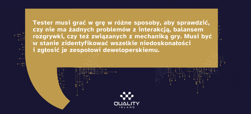 - Testowanie gry – Tester gier musi grać w grę, sprawdzając różne elementy, takie jak grafika, dźwięk, rozgrywka i interfejs użytkownika.