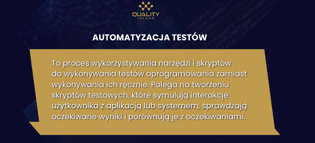 Automatyzacja testów to proces wykorzystywania narzędzi i skryptów do wykonywania testów oprogramowania zamiast wykonywania ich ręcznie. Polega na tworzeniu skryptów testowych, które symulują interakcje użytkownika z aplikacją lub systemem, sprawdzają oczekiwane wyniki i porównują je z oczekiwaniami. Automatyzacja testów ma na celu usprawnienie procesu testowania poprzez eliminację powtarzalnych i czasochłonnych czynności, które mogą być wykonywane przez narzędzia automatyzacyjne. W wyniku tego, testy mogą być wykonywane szybciej, efektywniej i bardziej dokładnie.