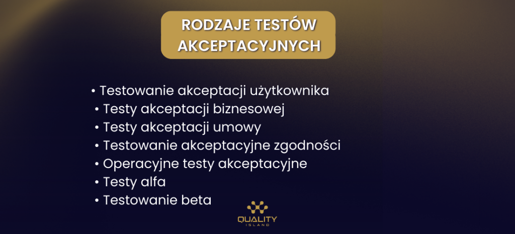 Wśród testów akceptacyjnych wyróżniamy następujące rodzaje: