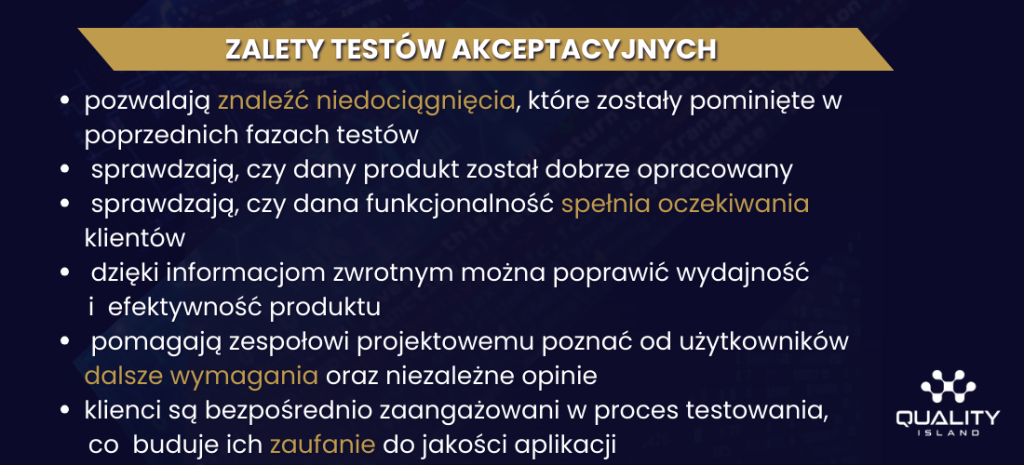 Jeśli chcesz, żeby testy akceptacyjne faktycznie dawały pewność „go/no-go” przed wdrożeniem (a nie były chaotycznym klikaniem na koniec projektu), Quality Island może pomóc uporządkować UAT: doprecyzować kryteria akceptacji, przygotować scenariusze pod procesy biznesowe oraz ustawić jasny sposób raportowania i priorytetyzacji defektów. Dzięki temu akceptacja przebiega szybciej, a ryzyko kosztownych poprawek po wdrożeniu znacząco spada.