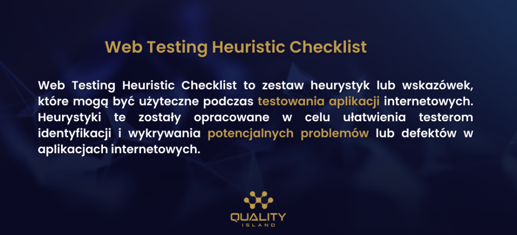 Web Testing Heuristic Checklist to zestaw heurystyk lub wskazówek, które mogą być użyteczne podczas testowania aplikacji internetowych. Heurystyki te zostały opracowane w celu ułatwienia testerom identyfikacji i wykrywania potencjalnych problemów lub defektów w aplikacjach internetowych.